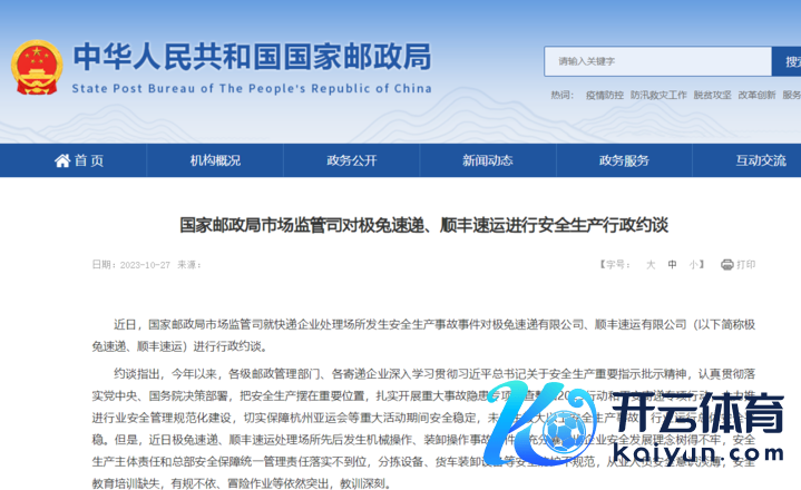 国度邮政局阛阓监管司对极兔速递、顺丰速运进行安全出产行政约谈