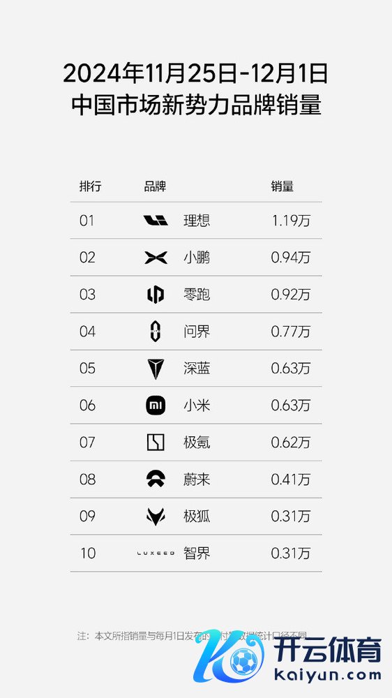 当作参考,2024年第47周(11.18-11.24)中国商场新势力品牌销量前特别别为:理念念(1.16万)、零跑(0.91万)、问界(0.75万)、小鹏(0.72万)、极氪(0.62万)、深蓝(0.61万)、小米(0.46万)、蔚来(0.40万)、极狐(0.28万)和阿维塔(0.23万)。