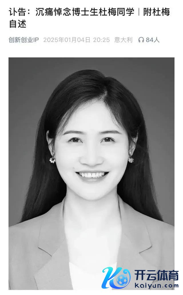 1 月 4 日,同济大学翻新创业 IP 课题组发布一则讣告,讣告炫耀同济大学优秀博士生杜梅于 1 月 3 日 21 时 58 分因病不幸殒命,享年 30 岁。杜梅本科就读于江苏科技大学东说念主文社科学院,硕士就读于上海大学,2021 年考入同济大学上海国际常识产权学院攻读搞定学博士学位。2024 年她访学时间被会诊出癌症,经过长达十个月的灾荒颐养,照旧离开了这个世界。杜梅的离世让宽绰网友感到恻然,群众纷繁在网上告别这名优秀的 95 后后生学者。