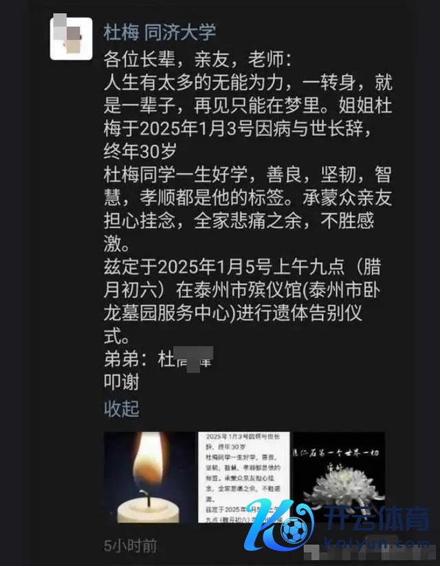 咱们悲恸获悉同济大学优秀博士生杜梅同学弥远隔开了咱们。杜梅同学,女,1995 年缔造,2025 年 1 月 3 日晚 21 时 58 分因病不幸殒命,享年 30 岁。
