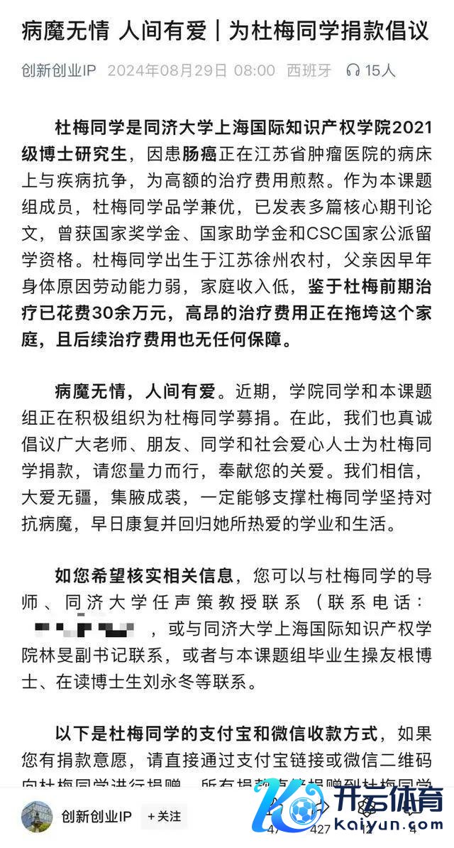 2024 年关于杜梅来说本是最值得期待与欢腾的一年,可悲讯也在这一年传来。在鲁汶大学访学不到两个月后,杜梅腰疼难忍,在欧洲当地病院稽察出体内存在肿块多处。归国后,她被确诊为十二指肠恶性肿瘤,为了颐养,一家东说念主转折上海、徐州、泰州等地。当代快报记者查询到,其间,徐州市同济大学学友会曾向她捐钱,学院同学也积极组织募捐,相沿她对抗病魔,早日康复。
