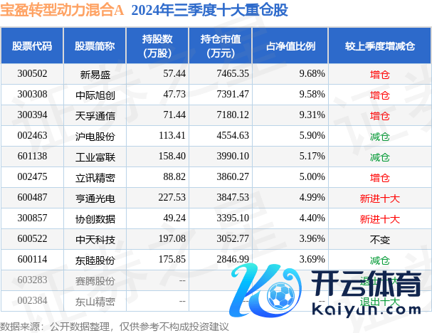 宝盈转型能源搀杂A为搀杂型-活泼基金,字据最新一期基金季报袒露,该基金金钱竖立:股票占净值比91.74%,无债券类金钱,现款占净值比14.88%。基金十大重仓股如下: