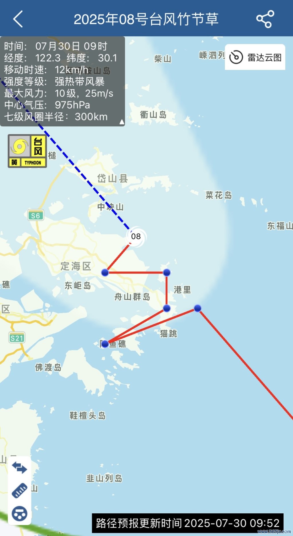 今晨4点30分,台风“竹节草”(热带风暴级)在浙江省舟山市朱家尖岛沿海登陆。随后几小时,“竹节草”却有些磨迟滞叽,在舟山境内“七拐八绕”,标的飘忽。