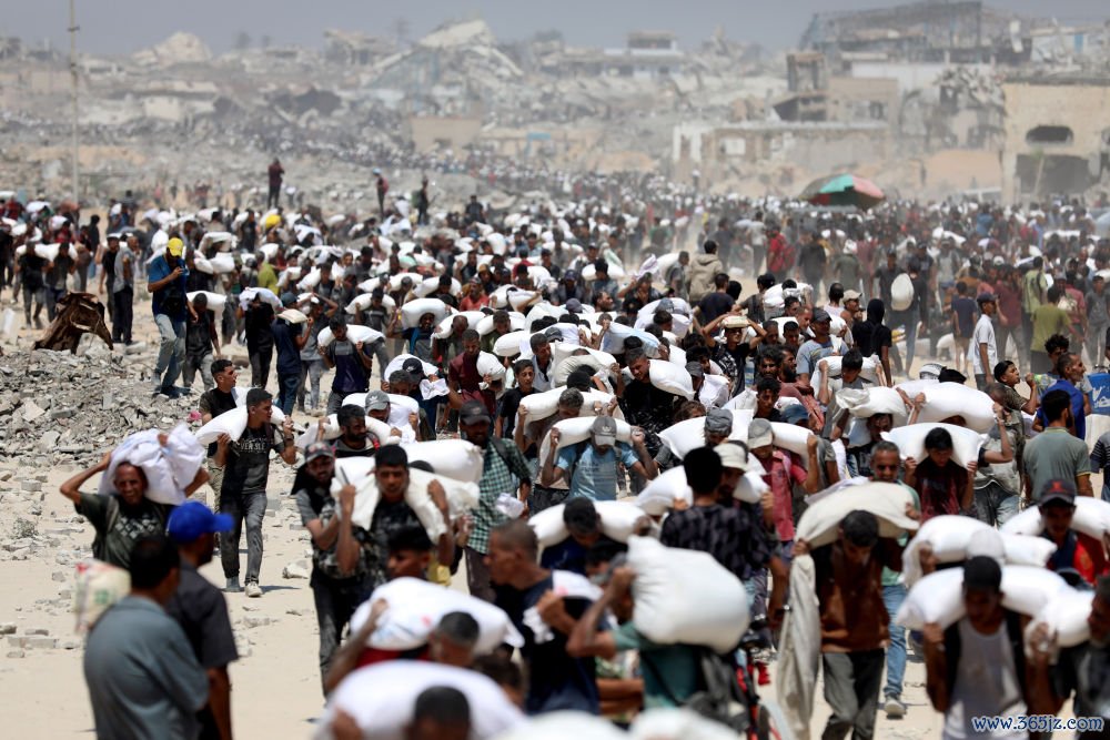 7月27日,在加沙地带北部城镇拜特拉希亚,东谈主们领取通过边境港口投入加沙的补助物质。新华社发(里泽克·阿卜杜勒贾瓦德摄)