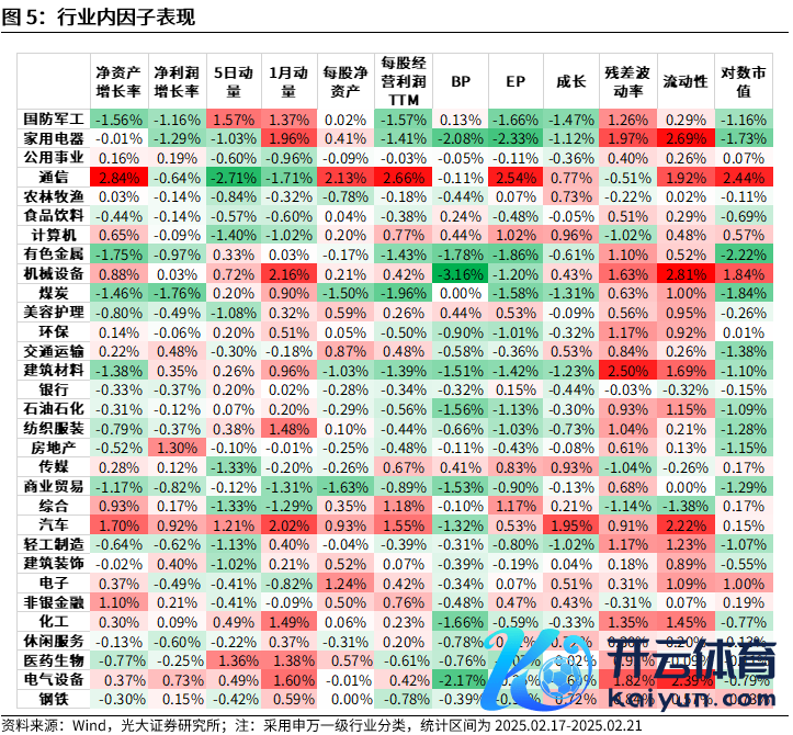 因子行业内施展,本周,净财富增长率因子在通讯行业施展较好,净利润增长率因子在房地产行业施展较好。每股净财富因子在通讯行业施展较好,每股办法利润TTM因子在通讯、汽车行业施展较好。5日动量因子在国防军工、医药生物、汽车行业动量效应昭着,在通讯行业回转效应昭着;1月动量因子在机械设立、汽车行业动量效应昭着,在通讯行业回转效应权贵。估值类因子中,BP因子在大量行业施展一般;EP因子在通讯行业施展较好。对数市值因子在通讯、机械设立行业施展较好;残差波动率因子在建筑材料行业施展零散,流动性因子在机械设立、家用电器、电气设立行业施展较好。