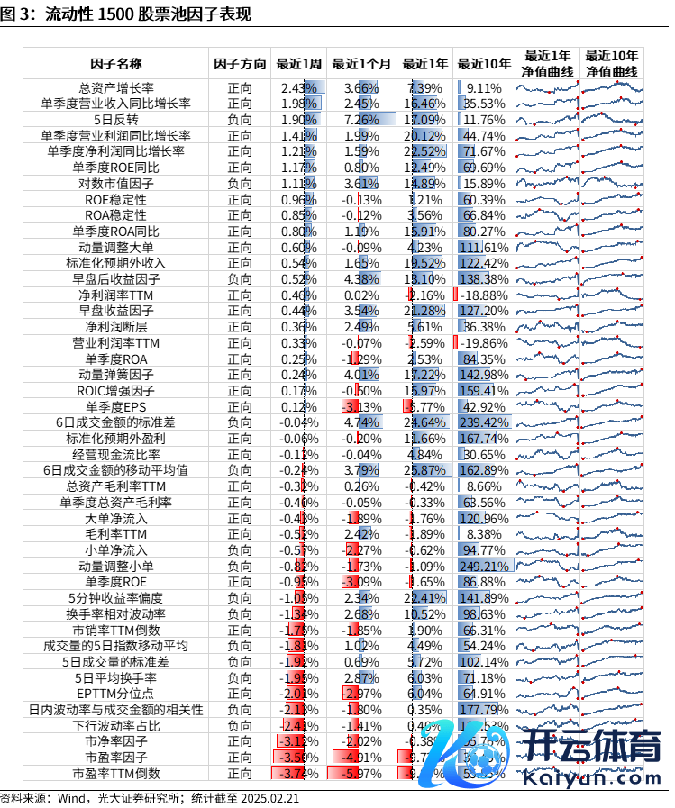 流动性1500股票池中,本周施展较好的因子有总财富增长率(2.43%)、单季度营业收入同比增长率(1.98%)、5日回转(1.90%)。施展较差的因子有市净率因子(-3.12%)、市盈率因子(-3.50%)、市盈率TTM倒数(-3.74%)。