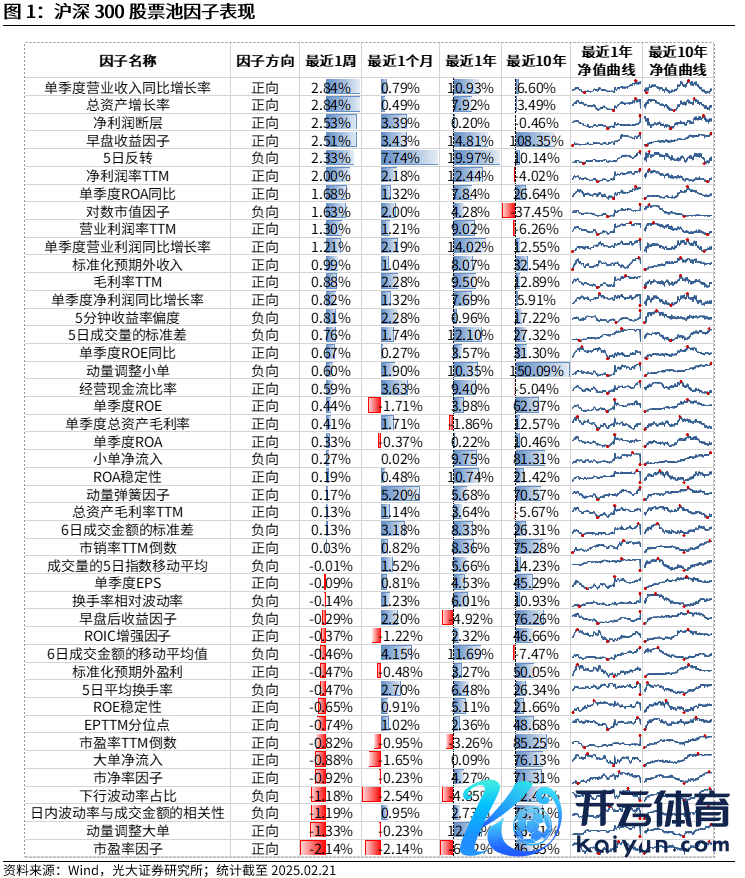 沪深300股票池中,本周(2025.02.17-2025.02.21,下同)施展较好的因子有单季度营业收入同比增长率(2.84%)、总财富增长率(2.84%)、净利润断层(2.53%)。施展较差的因子有日内波动率与成交金额的关连性(-1.19%)、动量退换大单(-1.33%)、市盈率因子(-2.14%)。